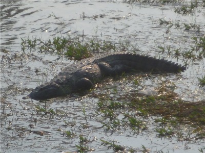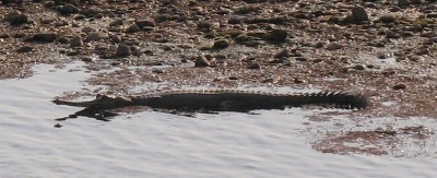Krokodil. Etwas später treffen wir auf Boote am Flußufer, die auf