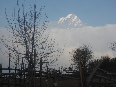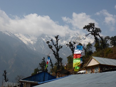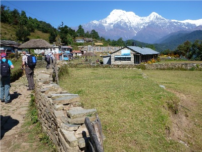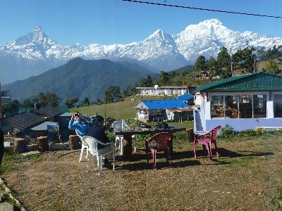 Trecking Tag 1: Ankunft an unserer Unterkunft. Im Hintergrund der Machhapucha (Fischschwanz Berg) und ein Annapurna Gipfel.
