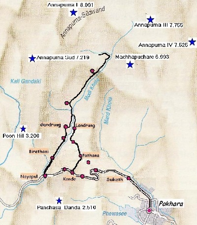 Der Mini Treck startete in Khande an der Strasse Pokhara - Bhaglung. Er führte uns nach Pothana und dann über Dhampus zur Strasse zurück. Der Annapurna Base Camp Treck ging von Khande über Pothana und Landrung zum Machapucha und Annapurna Basislager und über Birethani nach Nayapul zurück.